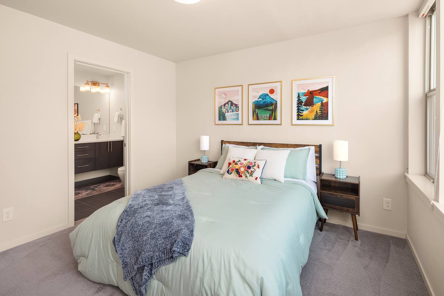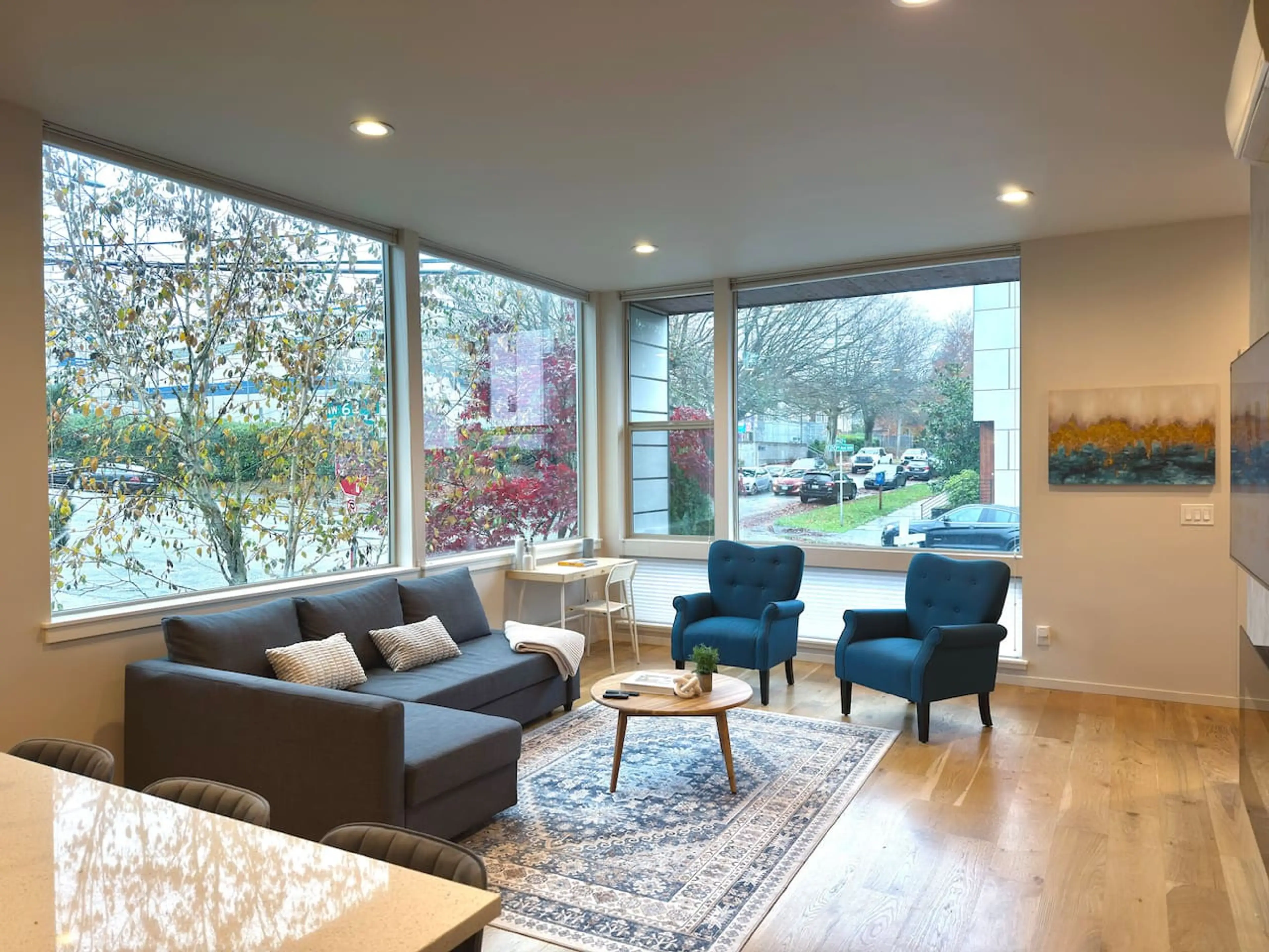 This light-filled 2-bedroom retreat features a beautiful kitchen with bar seating, comfortable live/work spaces, room to sleep up to six guests, and assigned parking. Step onto the rooftop balcony for fresh air and a peek at the Space Needle. Just blocks from Market Street with an excellent Walk Sco...